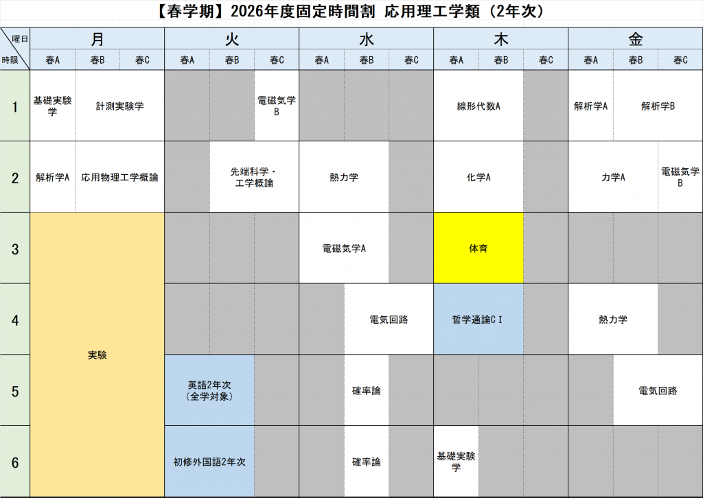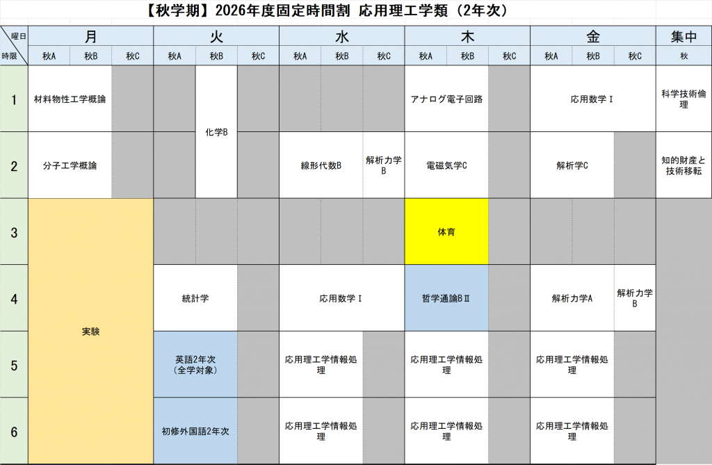 | 第1学年 | 第2学年 | 第3学年 | 第4学年 | ★体育、外国語については、「履修申請の手引き」、「開設授業科目一覧」、該当科目管轄のセンター、掲示物等にて確認し、正確な履修申請を行うこと。 2年生(共通)